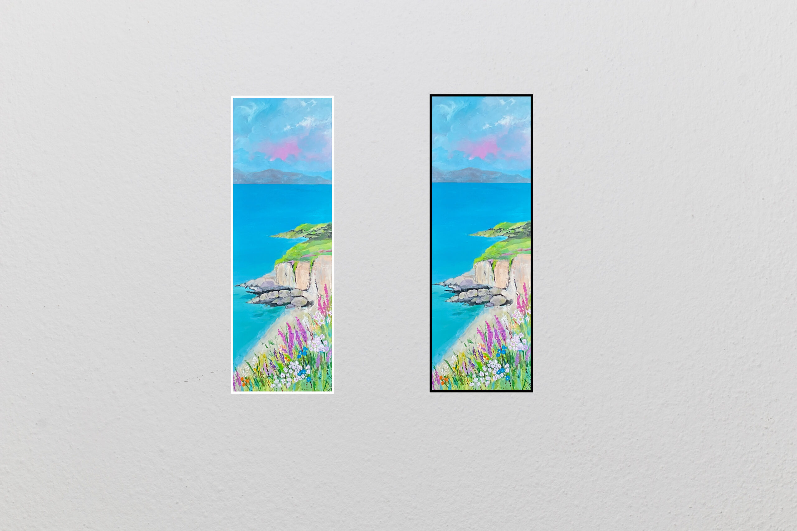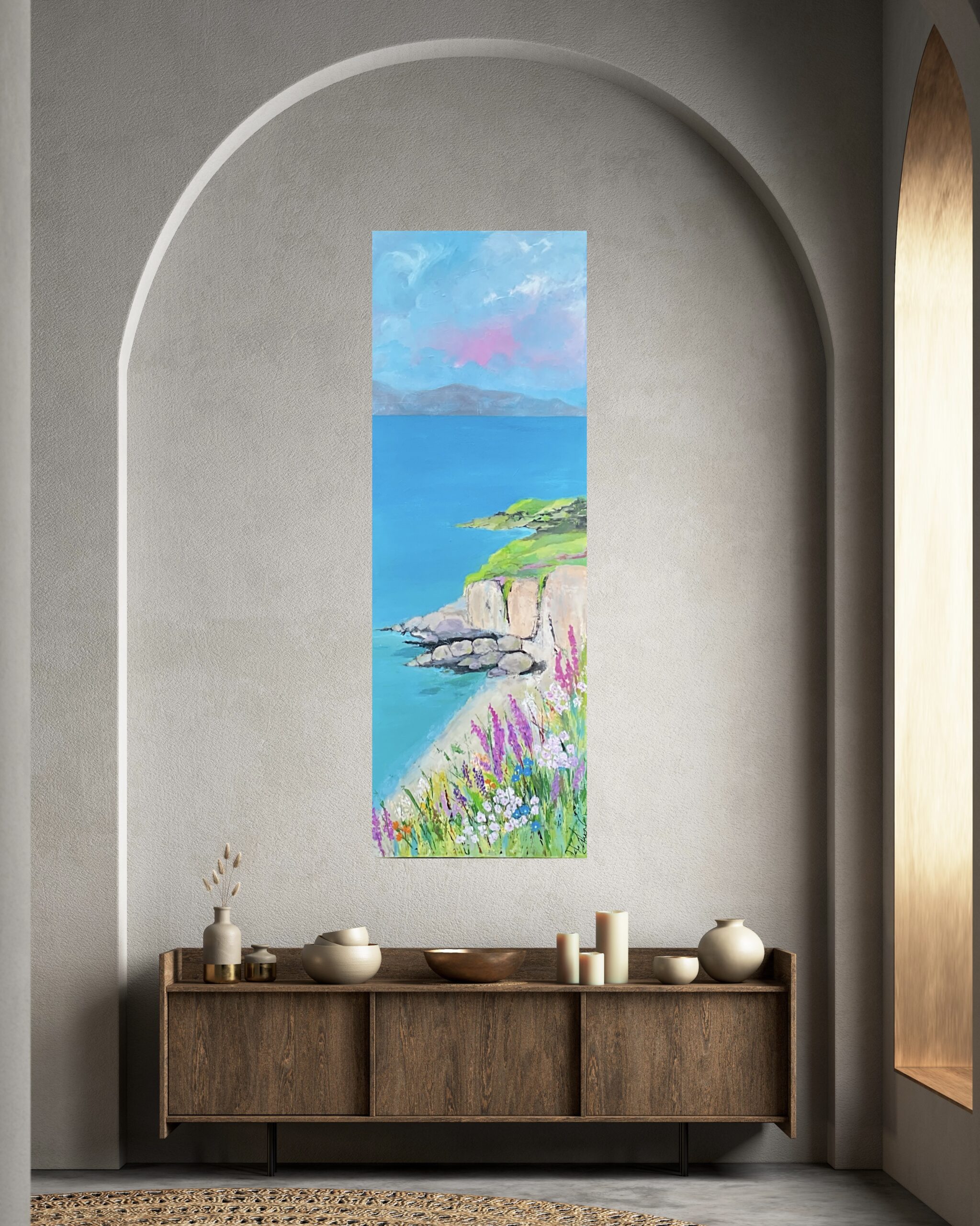 Naturalistisk landskabsmaleri i dejlige varme farver og en fantastisk udsigt over klipperne. Malet med akryl og oliepastel i flere lag, til den rette stemning var rigtig. Signeret og med ophæng. Sendes fragtfrit i DK.